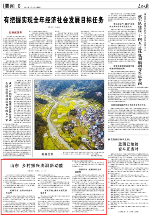 3月9日,《人民日?qǐng)?bào)》6版以《山東 鄉(xiāng)村振興澎湃新動(dòng)能》為題,點(diǎn)贊山東不斷創(chuàng)新體制機(jī)制,破解鄉(xiāng)村振興“人、地、錢(qián)”難題。以下為報(bào)道原文: